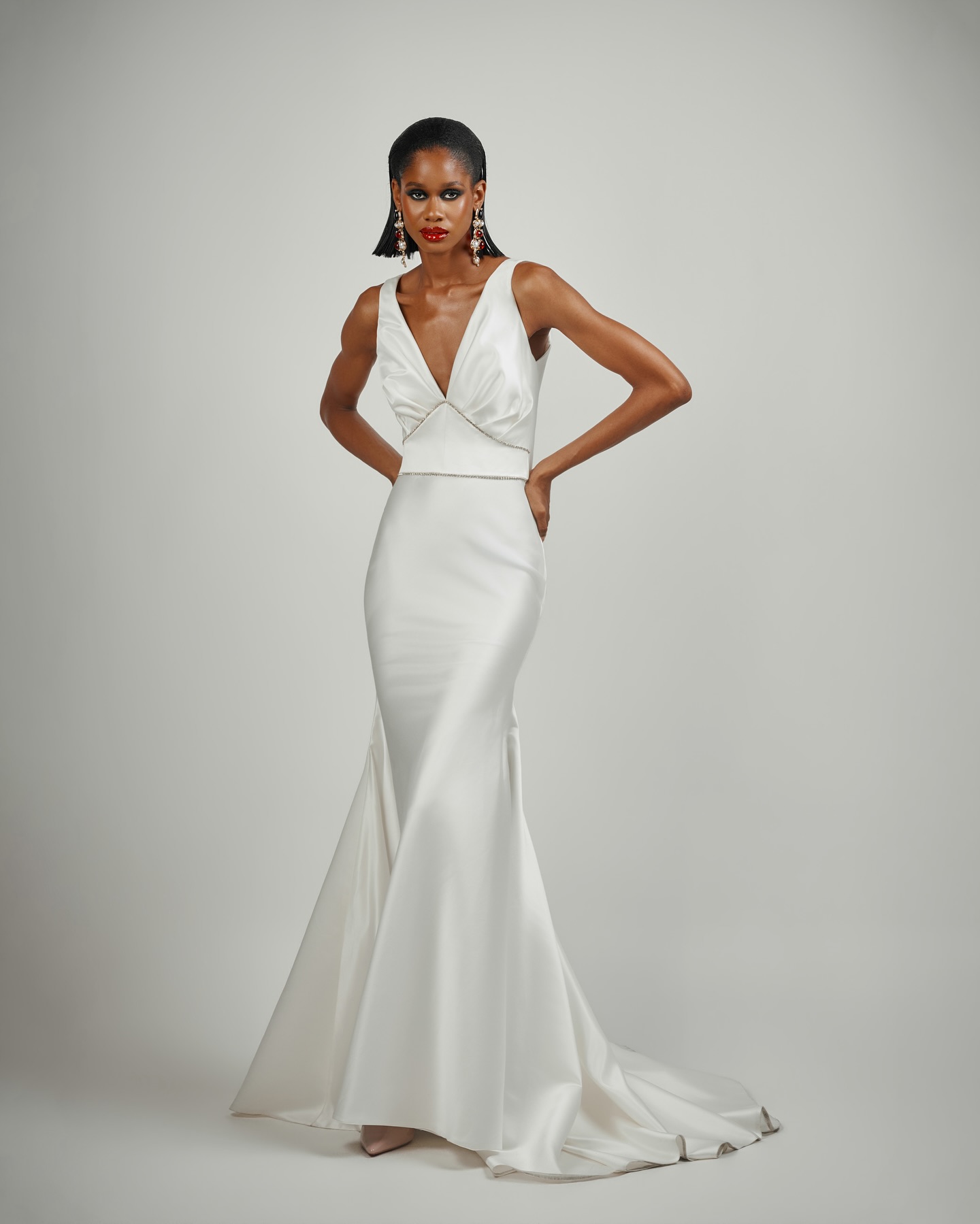 - Neckline: Dropped neckline.