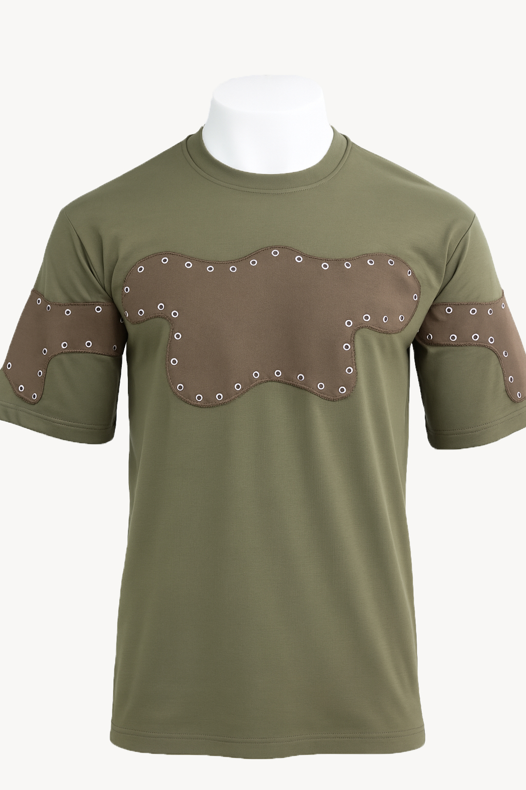 The DK T-Shirt 02 is crafted from soft-touch brown fabric and features black octopus leather patches with silver snaps on the chest and sleeve, with a crewneck silhouette. Finished with short sleeves, this shirt is suitable for casual and everyday wear.