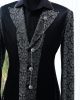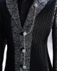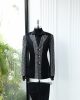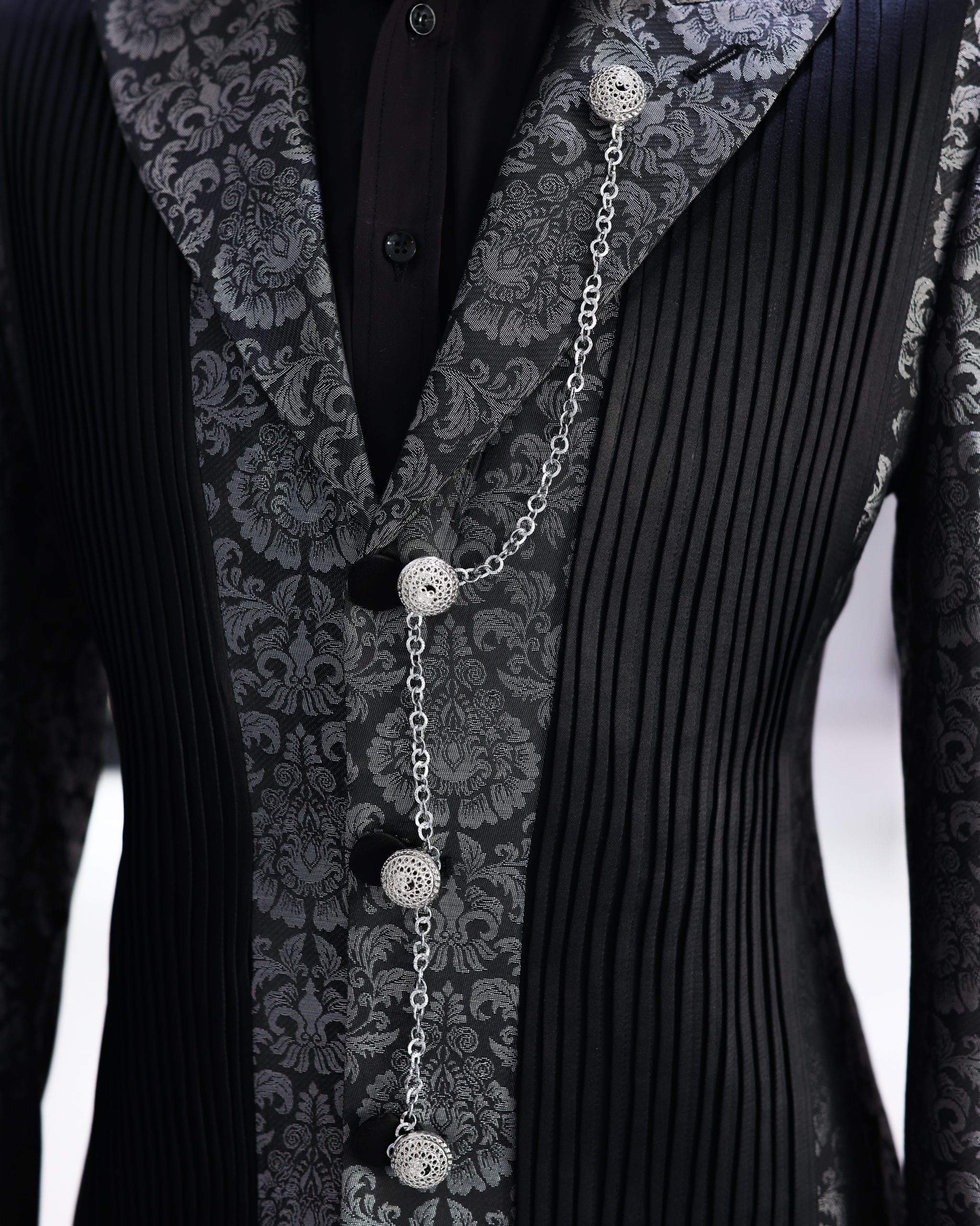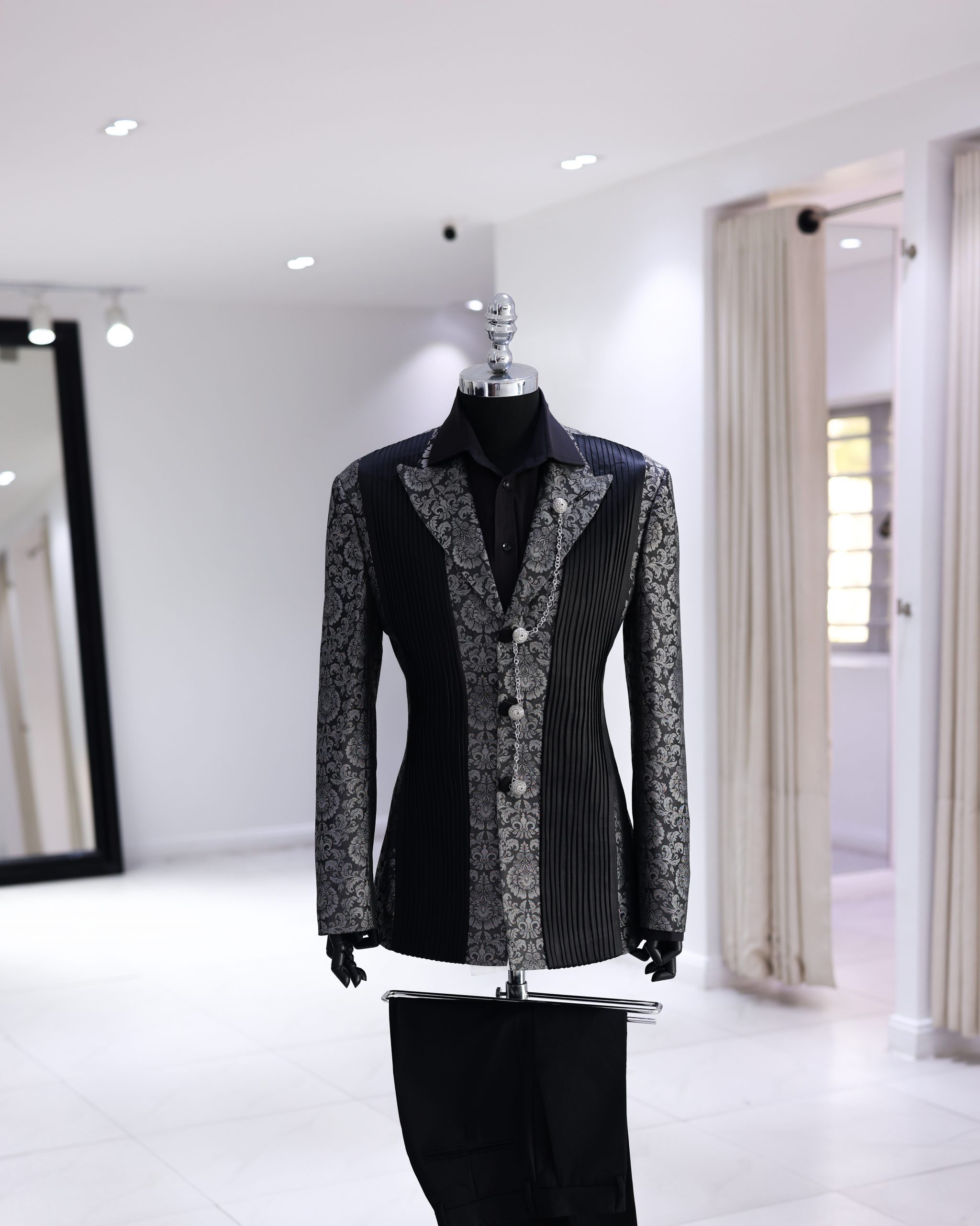 The Sapphire 1 vs 1 Suit: A tailored black jacquard jacket featuring a grey floral pattern, subtle pleated side panels, fabric-covered buttons, and a light chain detail. Paired with black trousers, it’s a sharp choice for any formal occasion.