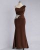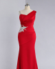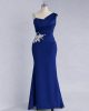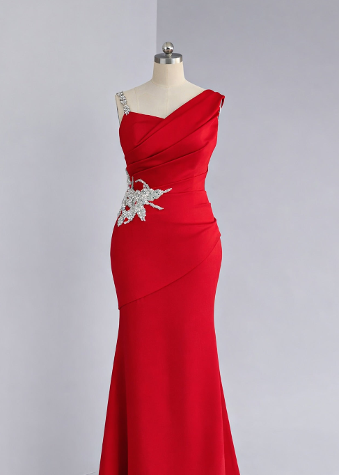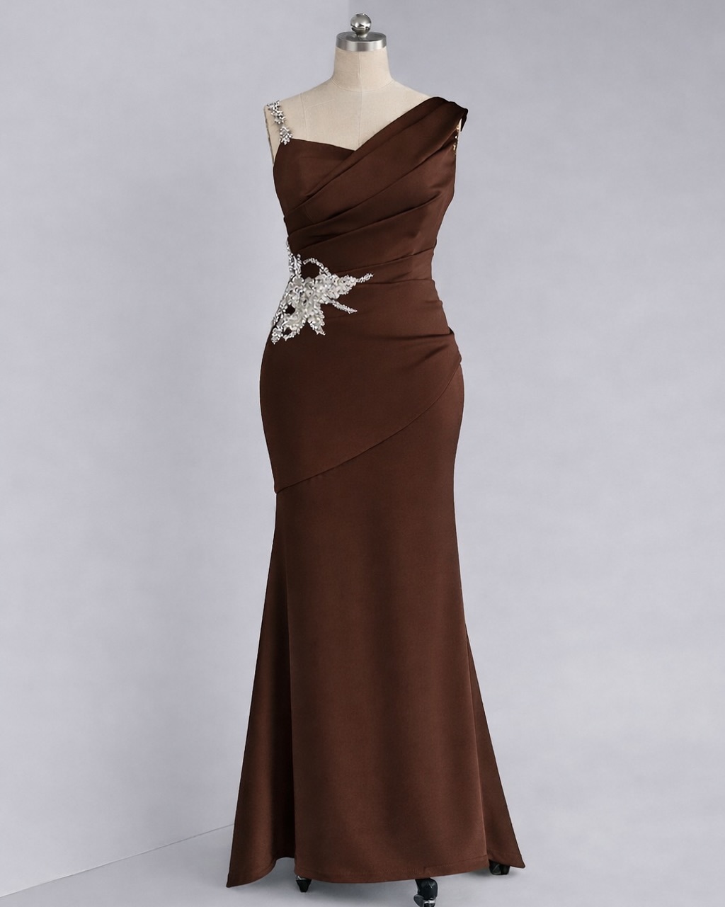 A fitted mermaid style dress with intricate ruching across the bodice creating a flattering, wrapped effect, with a large silver-tone crystal applique at the waist.
