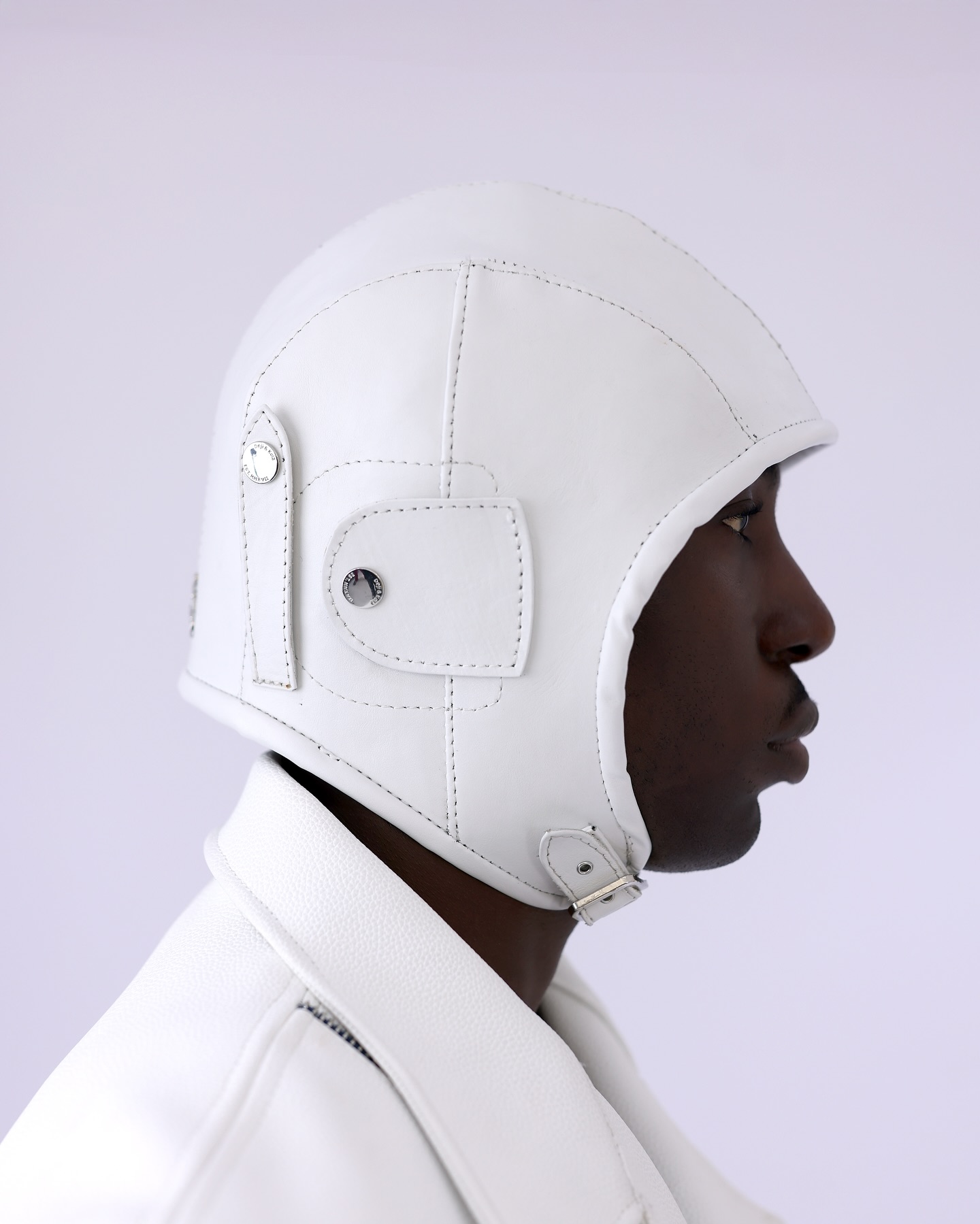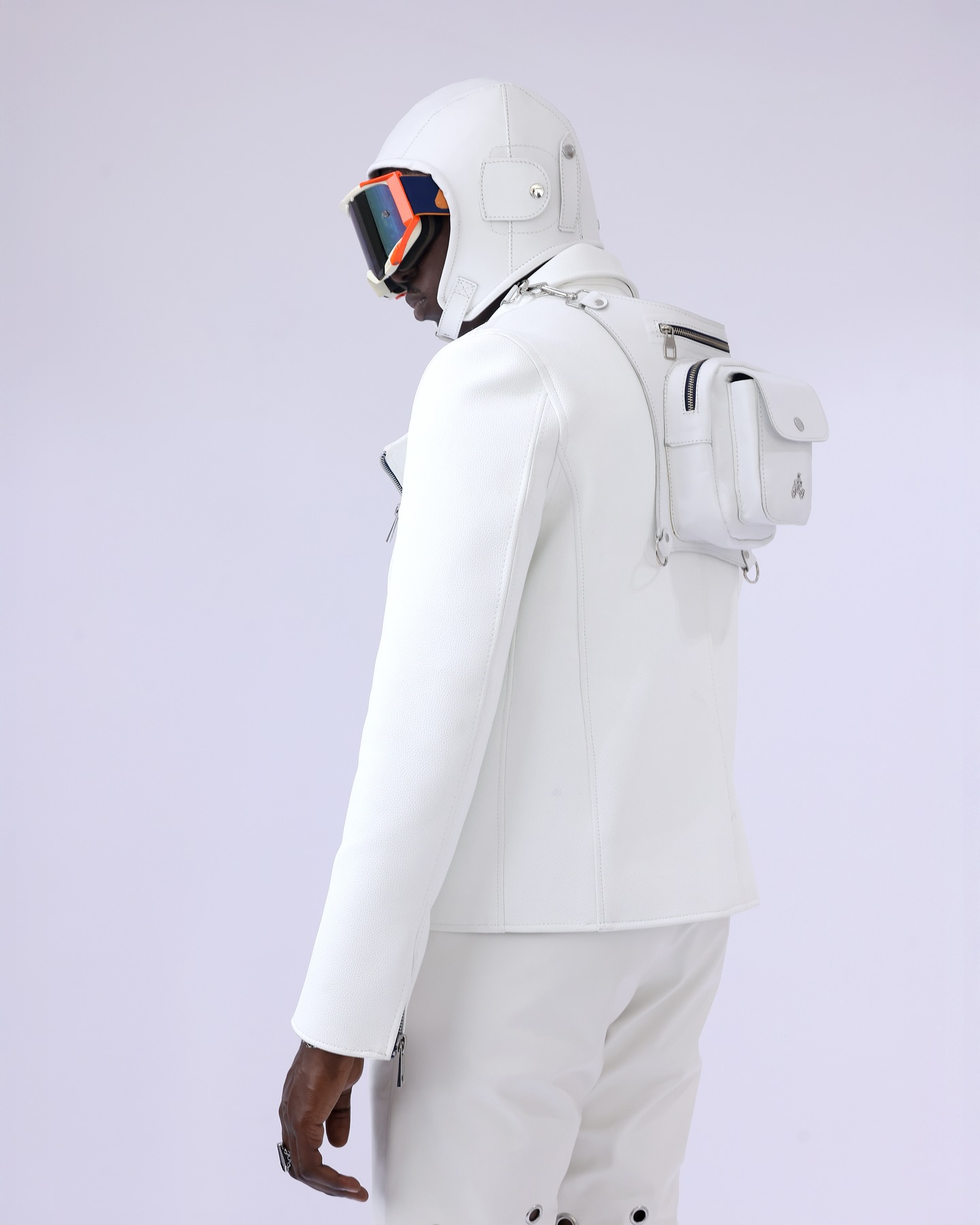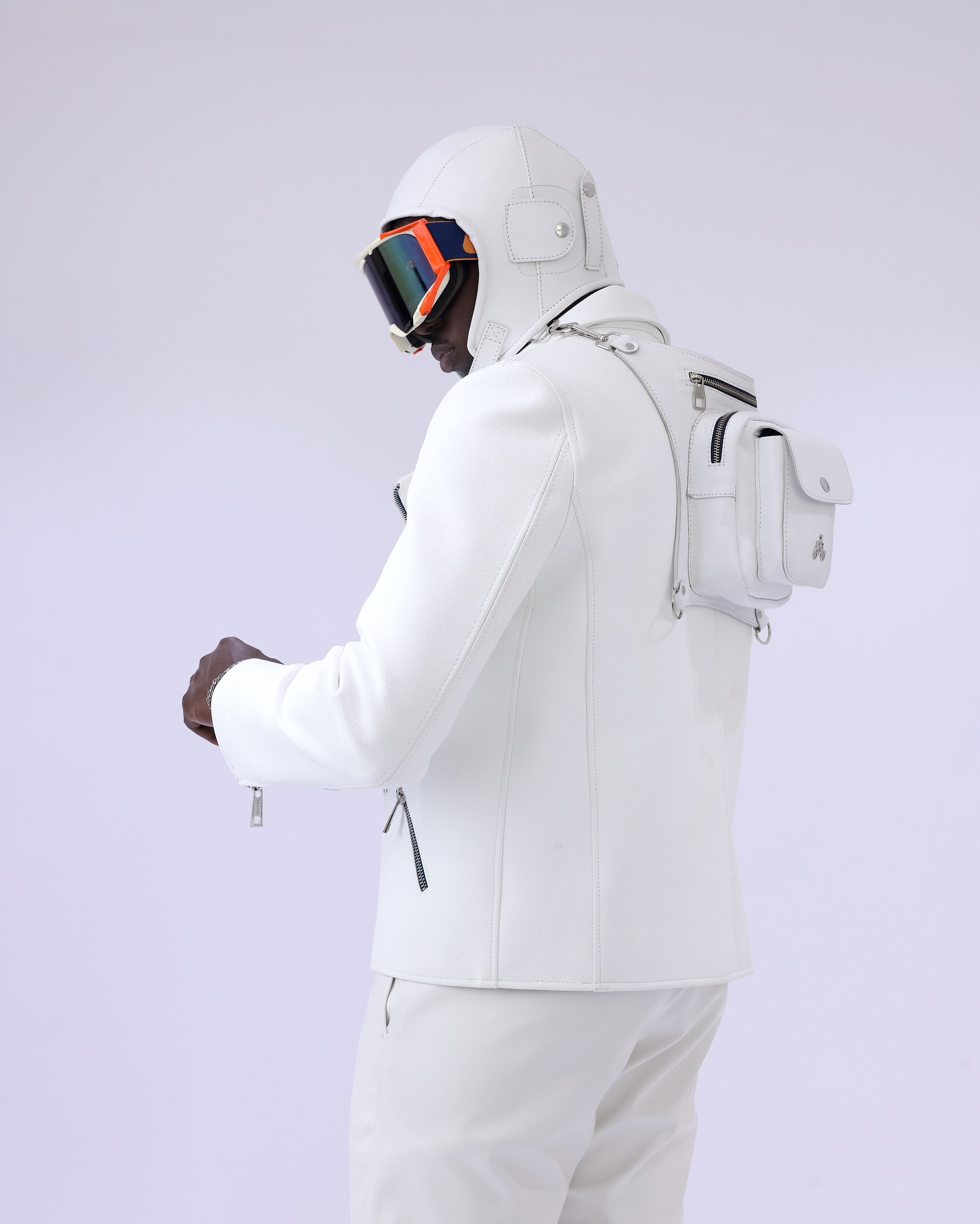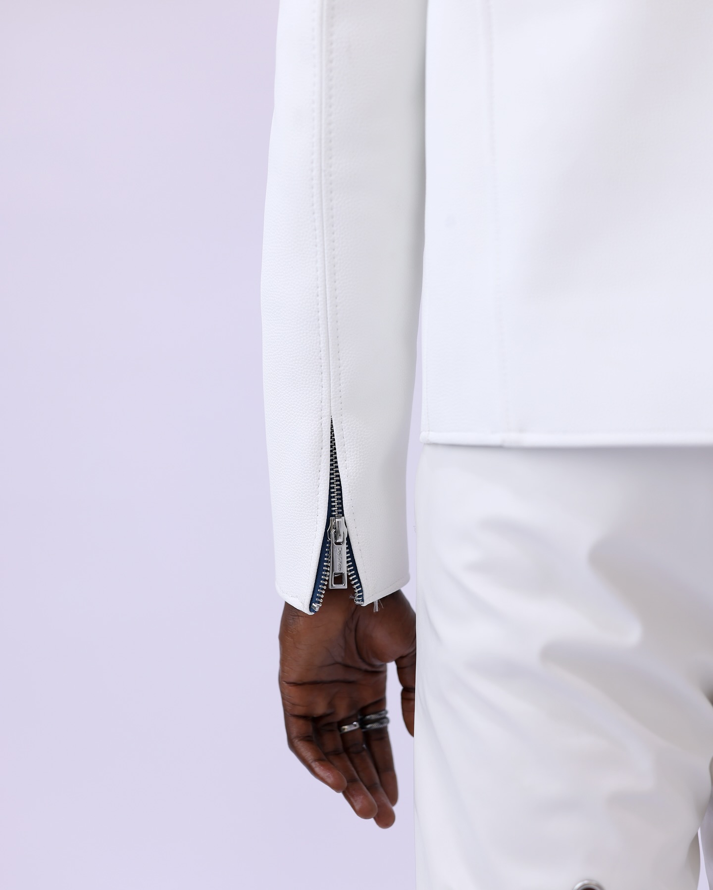 The UC2 – LK 6 – Leather A white grained leather jacket with a zipper, snap, and eyelet detailing. It comes with matching leather pants and Chelsea boots. The coat has a firm structure, the pants have a clean, straight cut, and the shoes complete the look. Easy to wear as a full set or mix with other pieces.