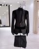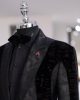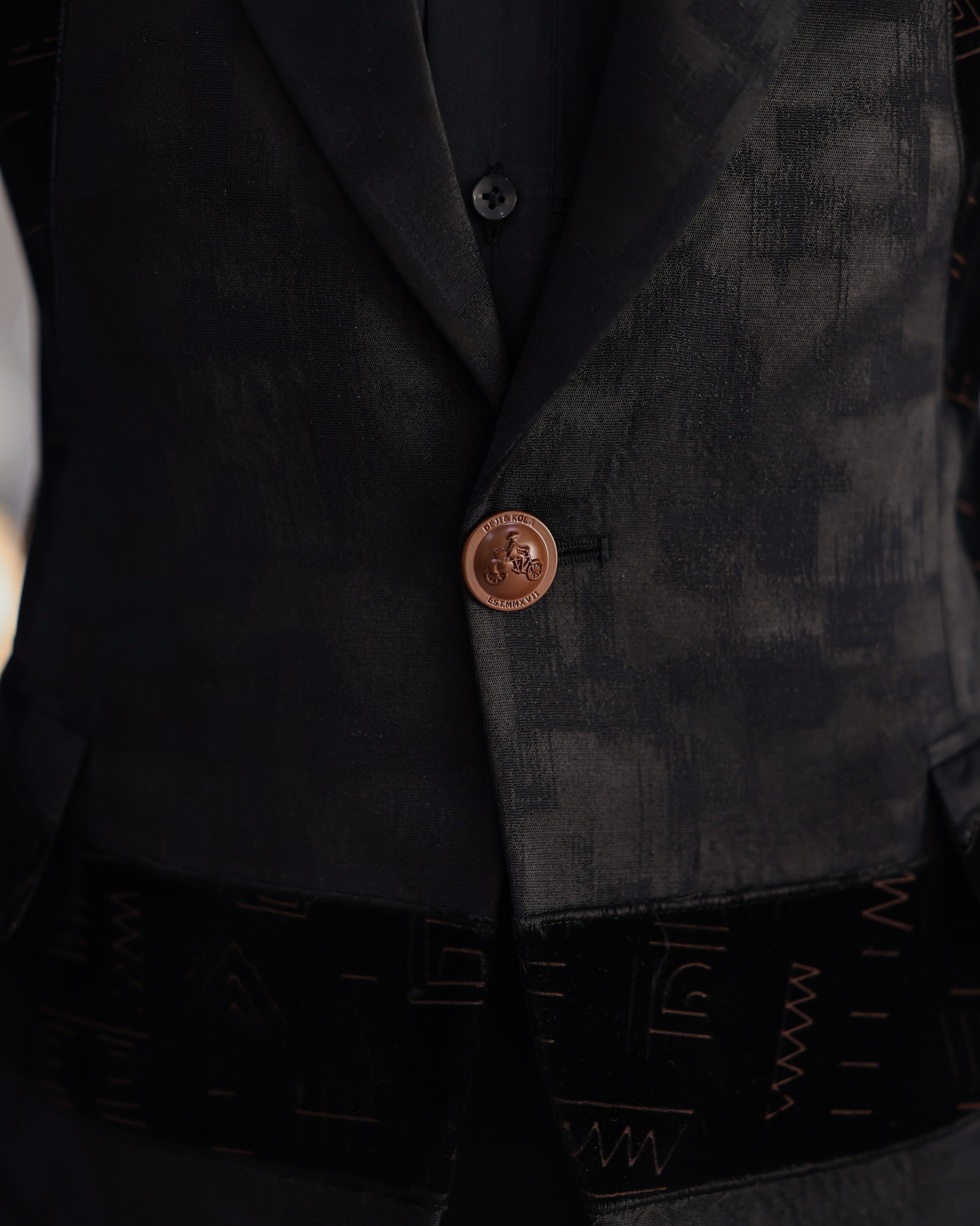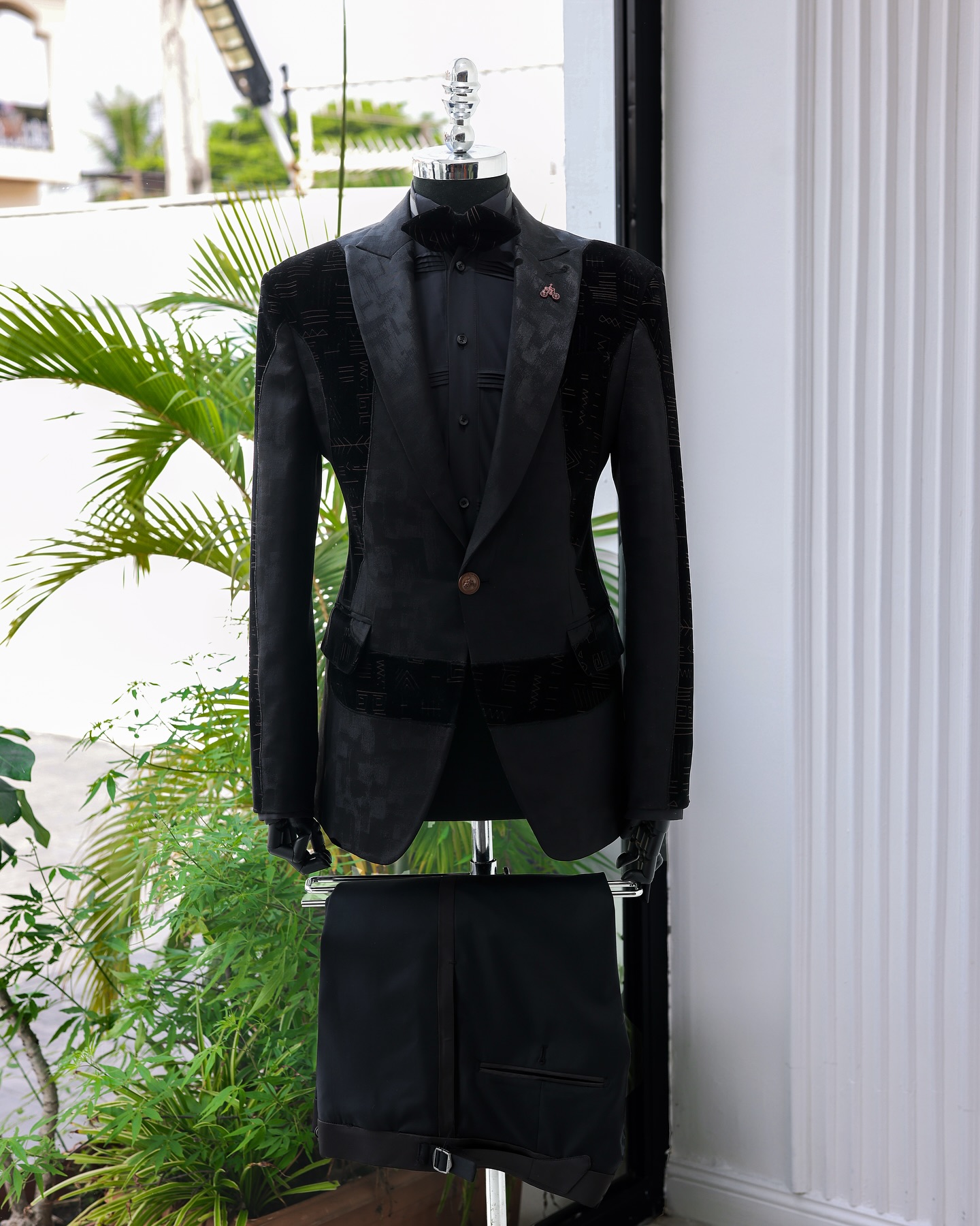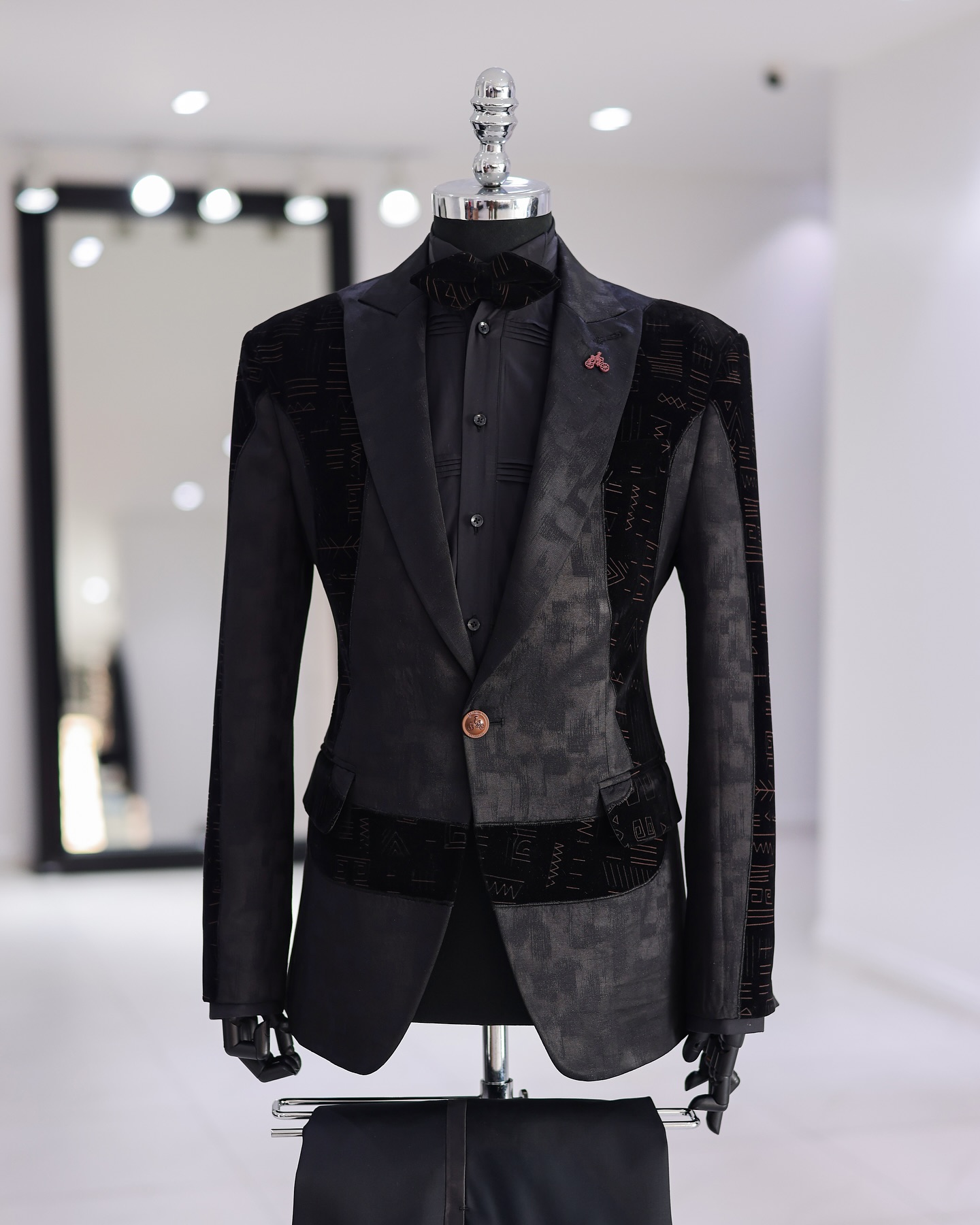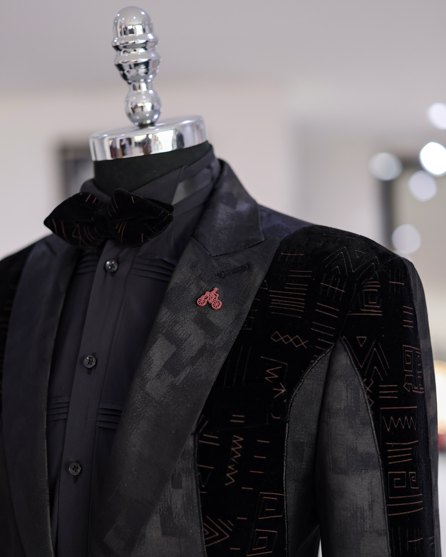 The “Wrap on Black” Suit 3: A black melted-pattern jacquard suit with a clean peak lapel finished in laser-engraved Alkebulan details on black velvet. It comes with a matching bow tie and tailored black pant trousers, creating a sharp and well-put-together look for formal occasions.